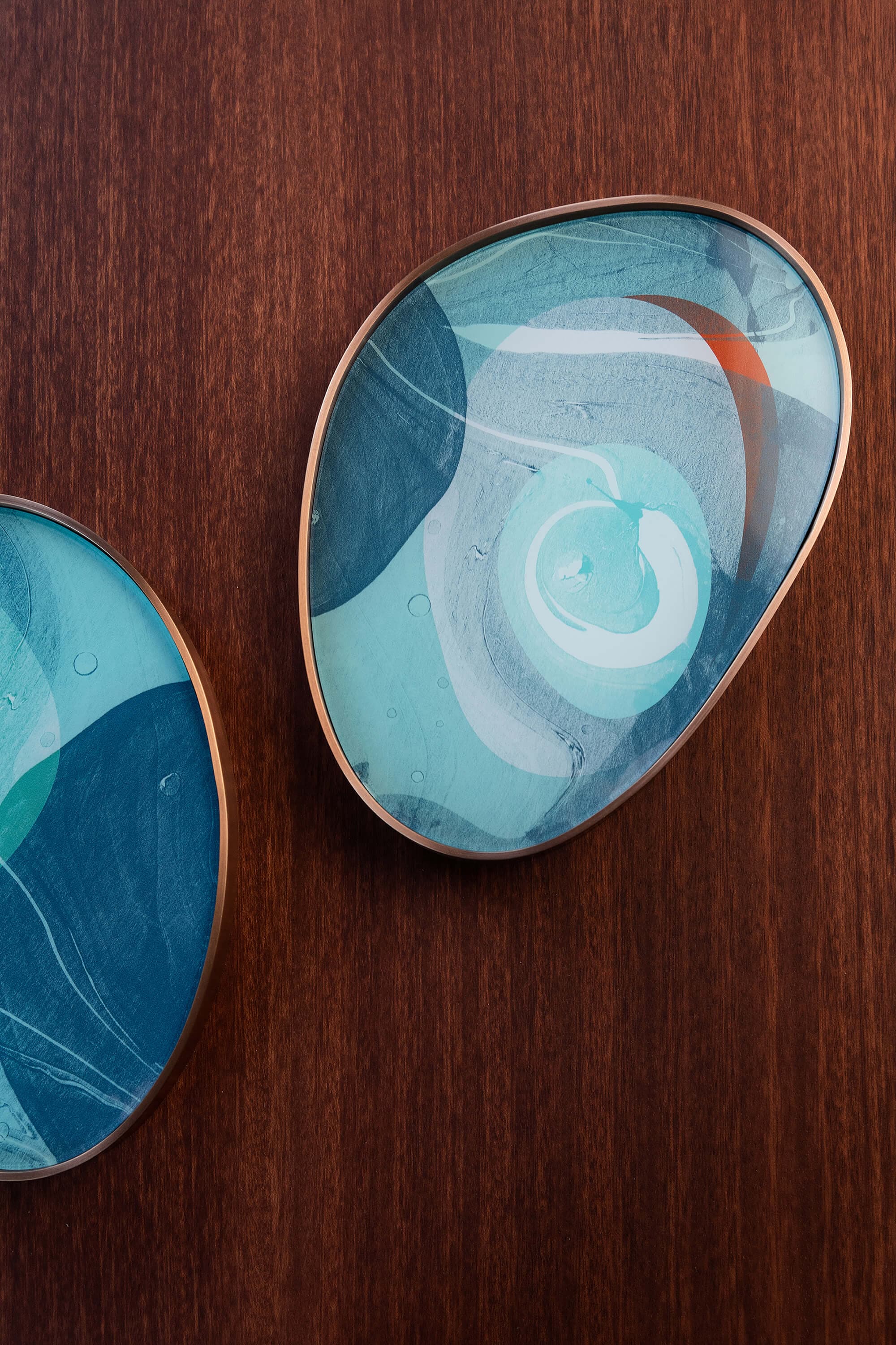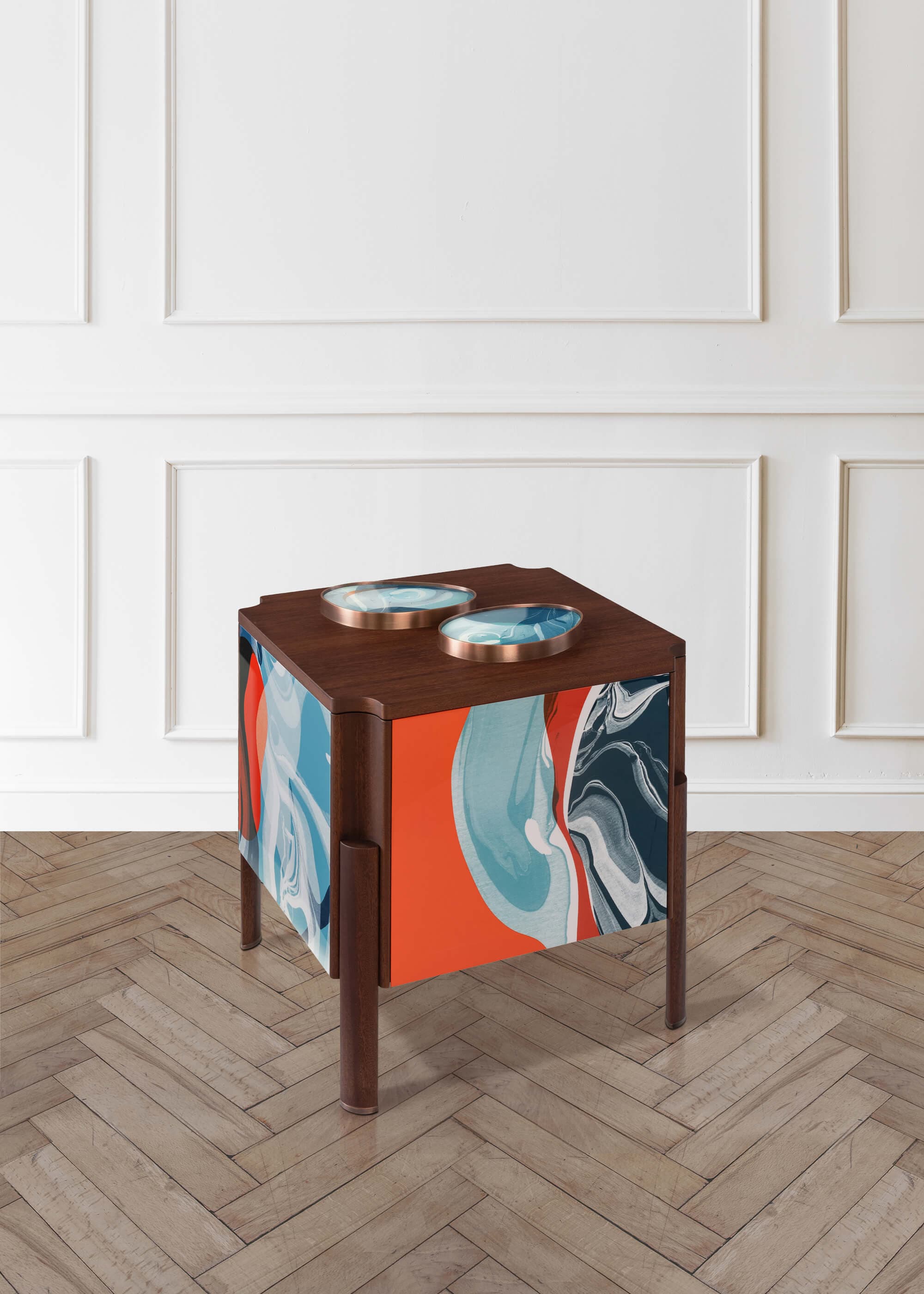 Each piece of furniture is crafted from a solid walnut structure, with side panels that are printed and varnished by hand with multiple layers of high gloss lacquer. A solid wood sliding top doubles as a table with its handles functioning as a little platform for your glass. Metal detailing is hand-worked to order for each piece by expert blacksmiths in copper plated brass.