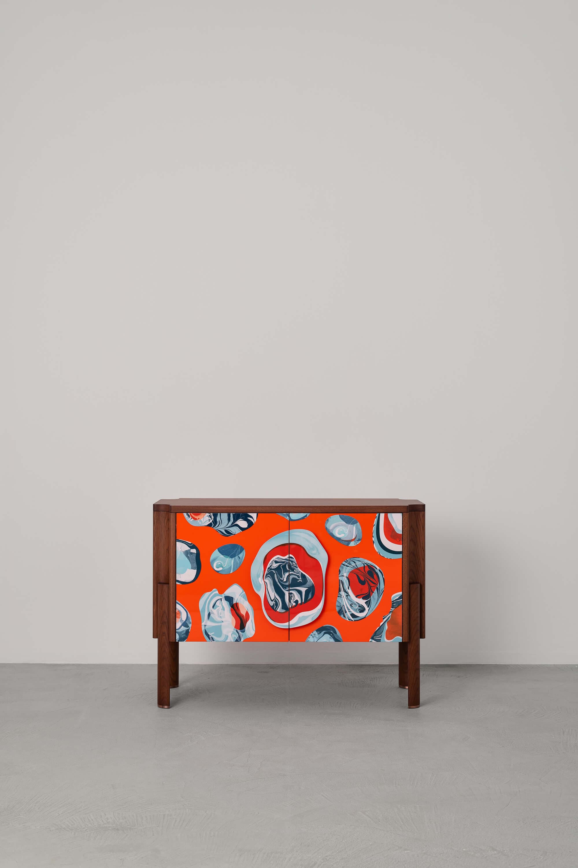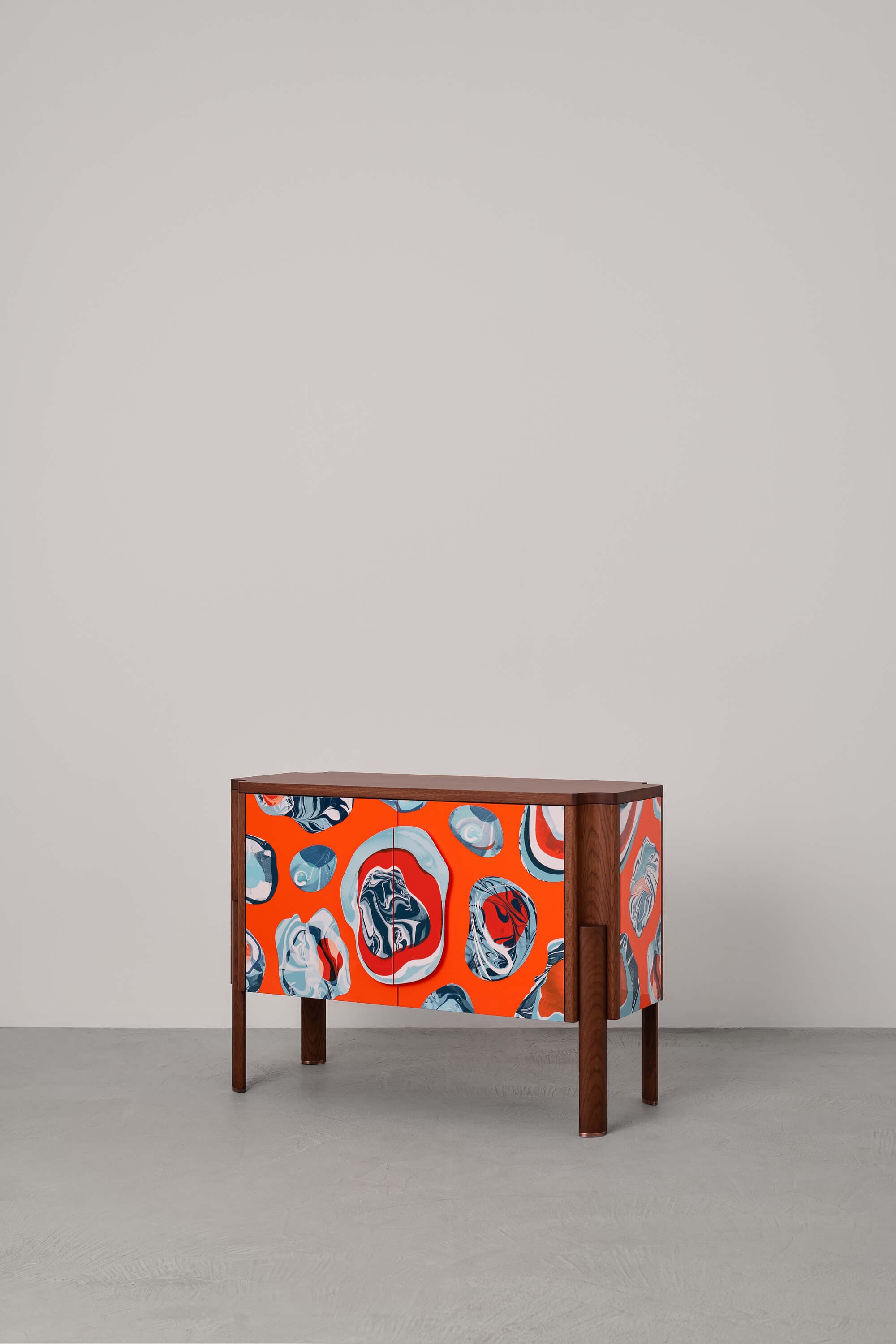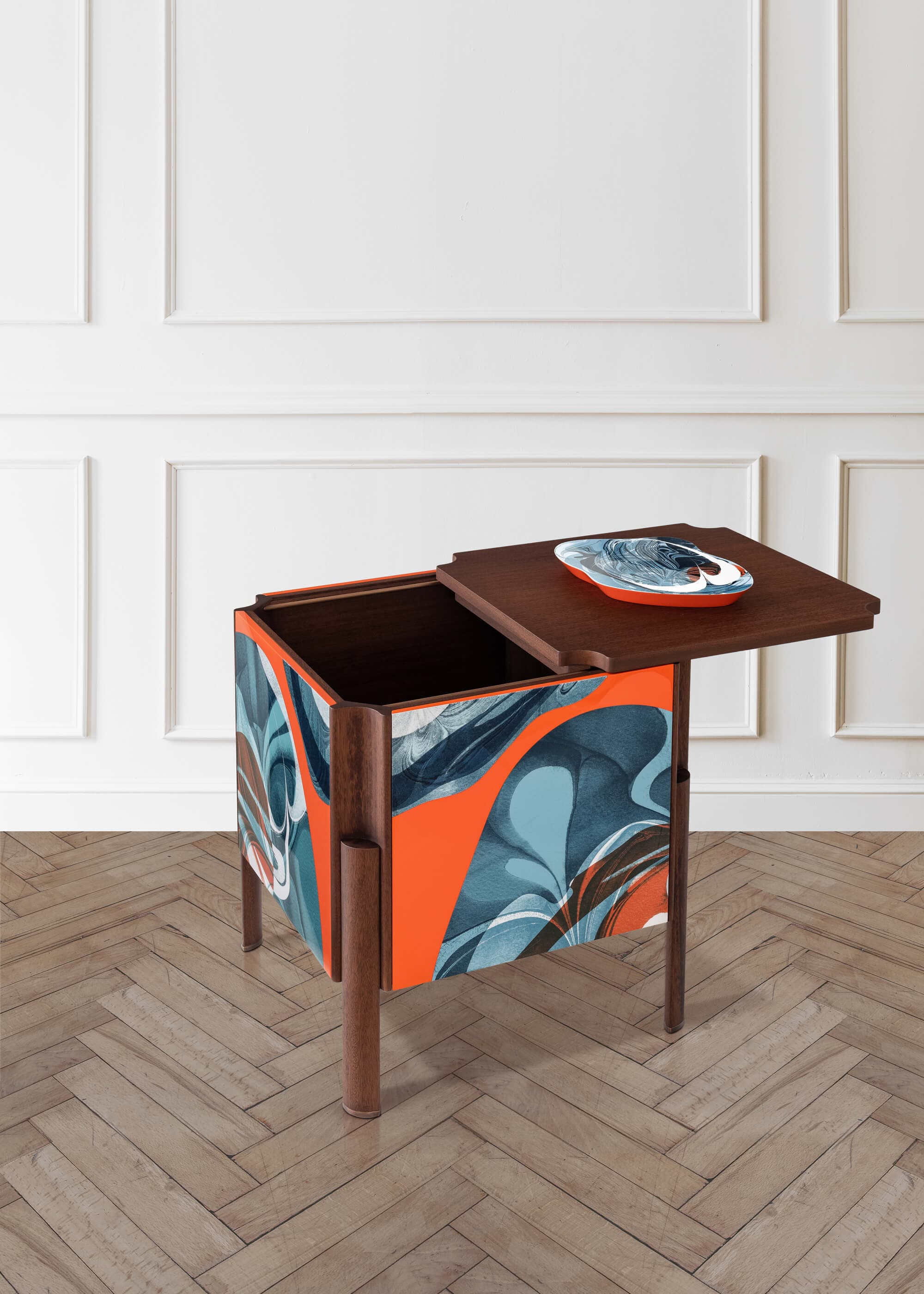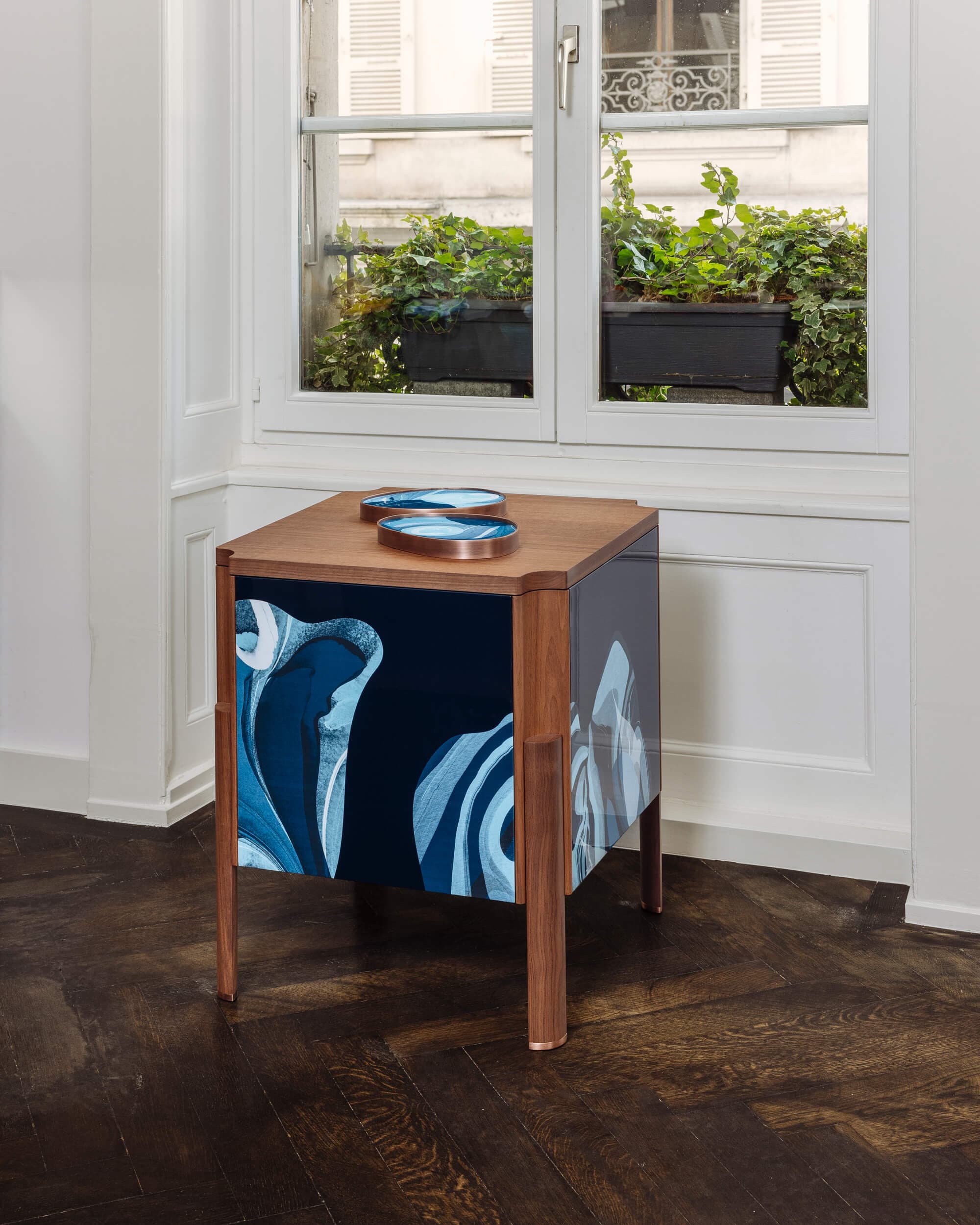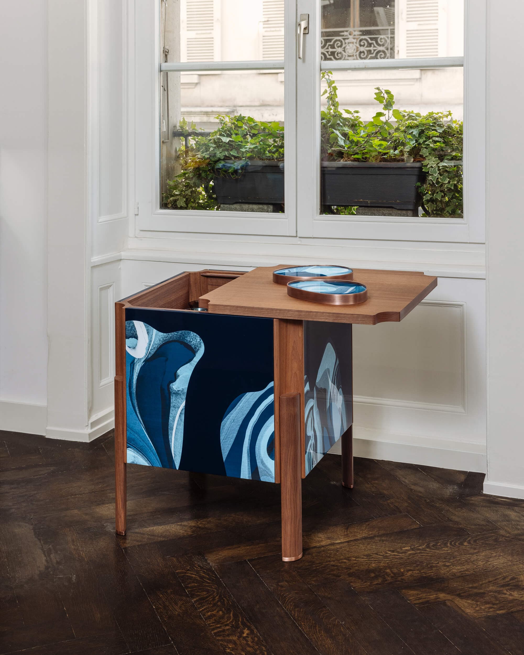 Each piece of furniture is crafted from a solid walnut structure, with side panels that are printed and varnished by hand with multiple layers of high gloss lacquer. A solid wood sliding top doubles as a table with its handles functioning as a little platform for your glass. Metal detailing is hand-worked to order for each piece by expert blacksmiths in copper plated brass.