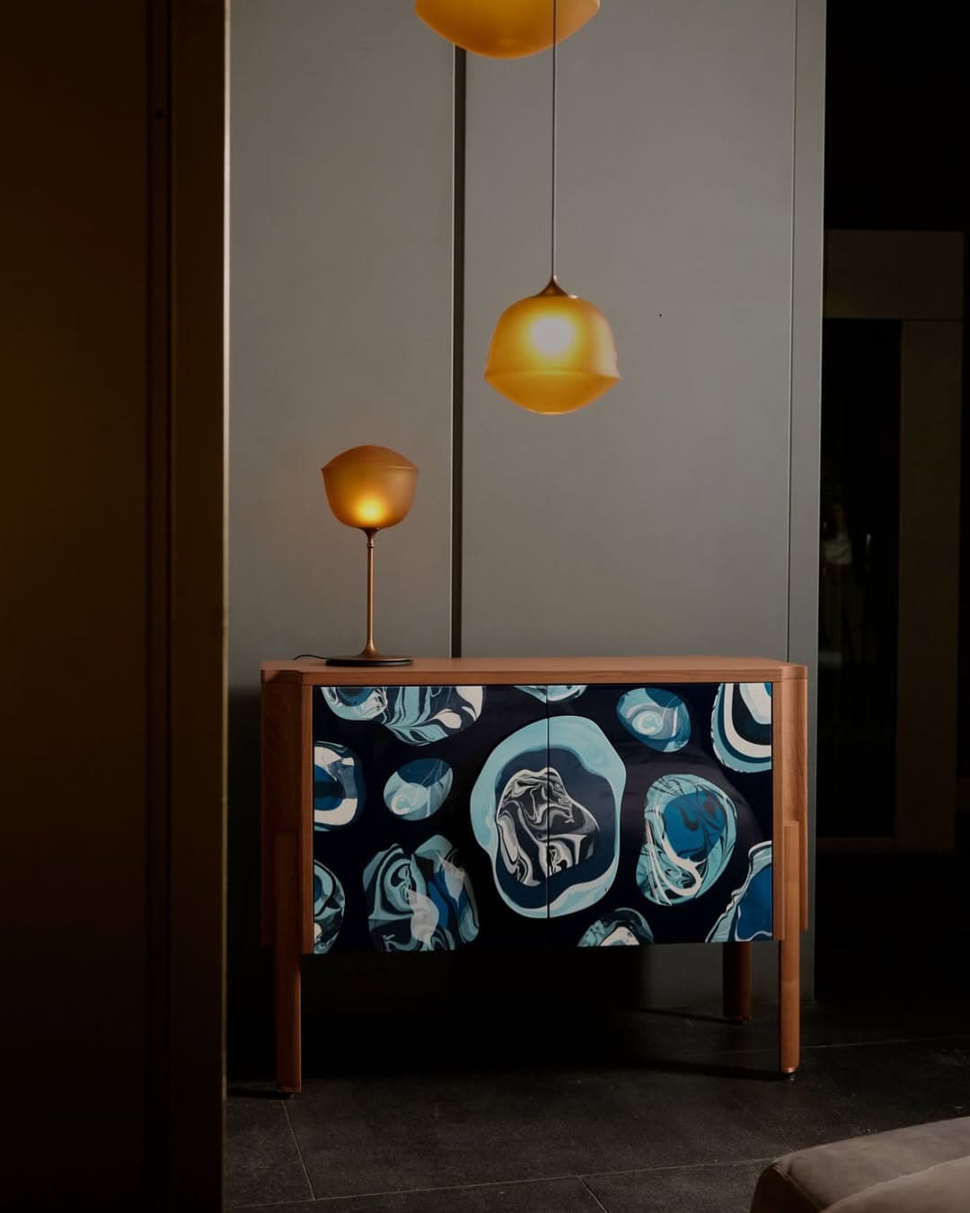 Each piece of furniture is crafted from a solid walnut structure, with side panels that are printed and varnished by hand with multiple layers of high gloss lacquer. A solid wood sliding top doubles as a table with its handles functioning as a little platform for your glass. Metal detailing is hand-worked to order for each piece by expert blacksmiths in copper plated brass.